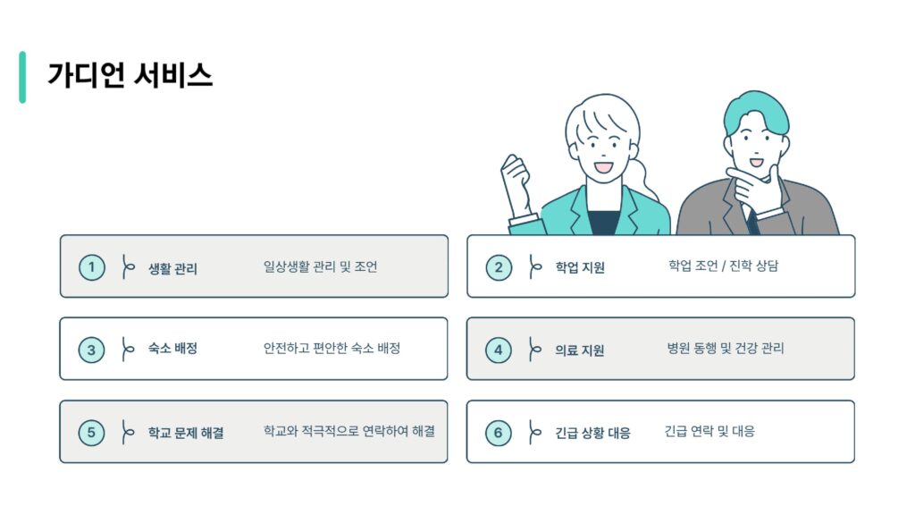 | 베이직/생활 가디언 | 법적 역할 + 기본적인 생활 및 학업 관리 (정기 만남, 응급 대처, 홈스테이 관리). | 대부분의 미성년자 단독 유학생이 선택하는 표준 서비스. |